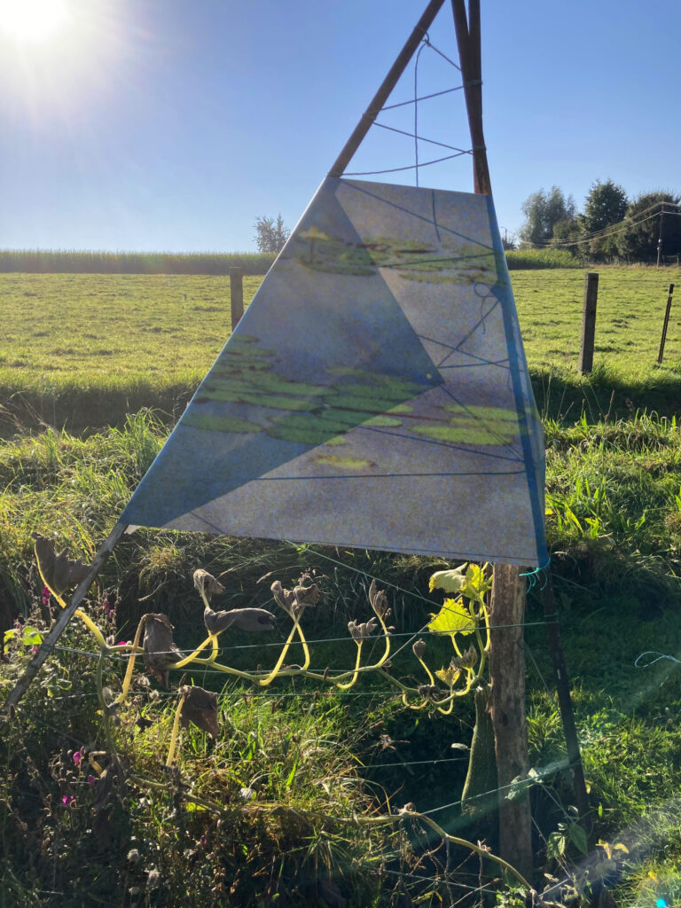 An art project taking waterlilies, all from the same photographic slide taken in Colombia in 1993, to a piece of land known as “The Golf” because of its 18 holes dug for fruit trees. Vaguely evoking an indigenous settlement, they set sail, they interact with the light of day, the morning dew, and their terrestrial cousins.